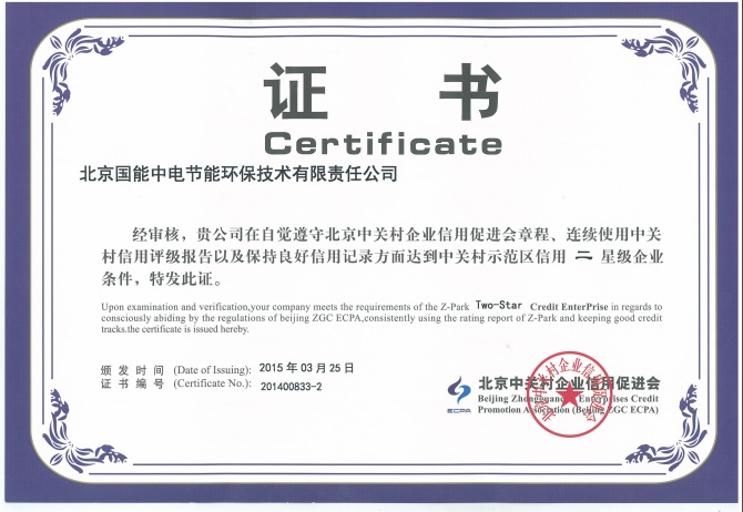 熱烈祝賀我公司榮獲“中關(guān)村示范區(qū)信用二星級(jí)企業(yè)證書”。國(guó)能中電已連續(xù)一年保持升級(jí),證明國(guó)能中電在信用度方面贏得中關(guān)村管委會(huì)及中國(guó)人民銀行的認(rèn)可,企業(yè)融資能力不斷攀升,我公司可享受比例為25%的企業(yè)貸款貼息。