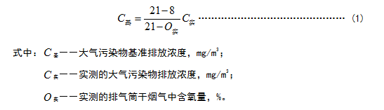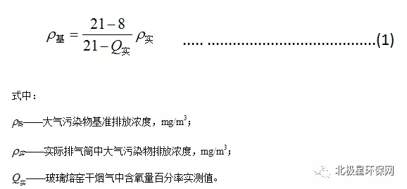 1.4 對于玻璃熔窯排氣(純氧燃燒除外),應同時對排氣中含氧量進行監(jiān)測,實測排氣筒中大氣污染物排放濃度應按式(1)換算為含氧量為8%狀態(tài)下的基準排放濃度,并以此作為排放是否達標的依據(jù)。其他車間或生產設施排氣按實測濃度計算,但不得人為稀釋排放。