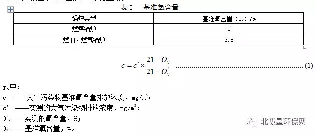 實測的鍋爐顆粒物、二氧化硫和氮氧化物排放濃度,必須按公式(1)折算為基準氧含量排放濃度。燃煤鍋爐的基準氧含量按表5的規(guī)定執(zhí)行。